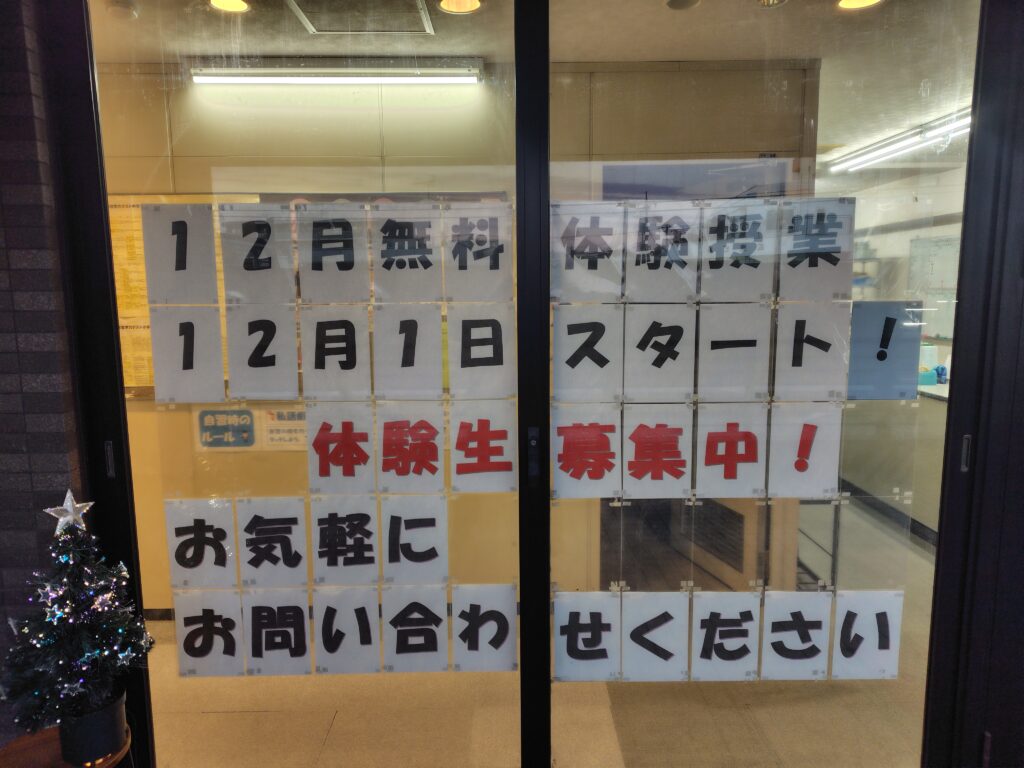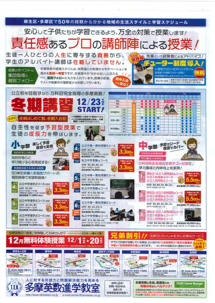 12月1日(月)から12月19日(金)までの最大3週間、多摩英数進学教室では、通常の本科授業に無料でご参加いただける「無料体験授業」を実施いたします。普段の本科授業に実際に参加していただき、授業・指導法そして様々なサービスをご体験の上、ご入会を判断いただけます。