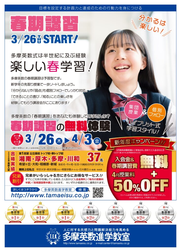 多摩英数の春期講習の授業を無料で体験できます。※教材費は別途かかります。