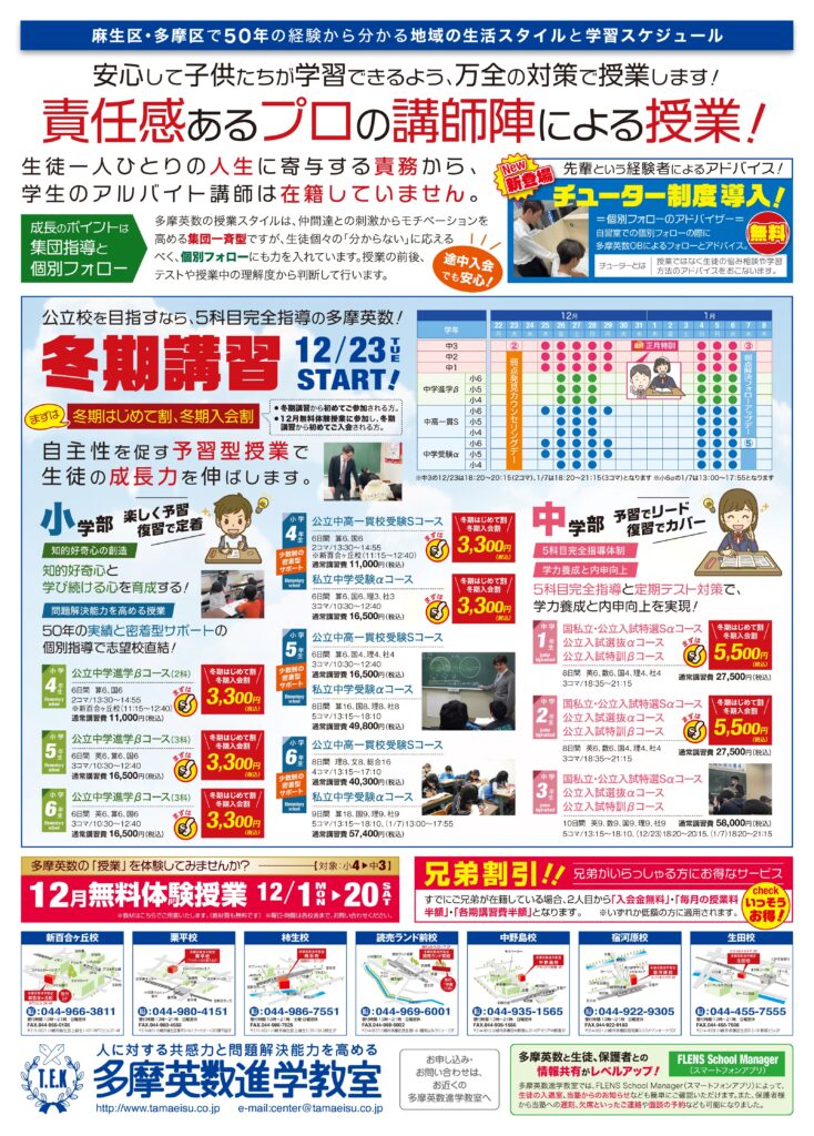 12月1日(月)から12月19日(金)までの最大3週間、多摩英数進学教室では、通常の本科授業に無料でご参加いただける「無料体験授業」を実施いたします。普段の本科授業に実際に参加していただき、授業・指導法そして様々なサービスをご体験の上、ご入会を判断いただけます。